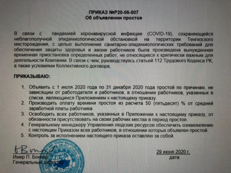 По данным издания, "Тенгизшевройл" (ТШО) подтверждает, что распространяемый в социальных сетях приказ "Об объявлении простоя" является действительным и распространяется на работников ТШО. Об этом сообщили в пресс-службе компании.