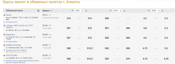 По данным kurs.kz, сейчас обменники продают доллар по 512-514 тенге. Покупают - по 507-510 тенге.