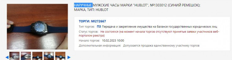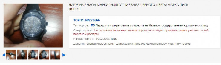 Часы были предложены государственным юридическим лицам, так как этого требуют правила реализации или использования имущества, арестованного на основании приговора суда по уголовному делу в части конфискации имущества. Согласно правилам, первоначально имущество (за исключением отдельных видов) предлагается государственным юридическим лицам для передачи на их баланс, после чего, в случае нецелесообразности или невостребованности, выставляется на продажу.