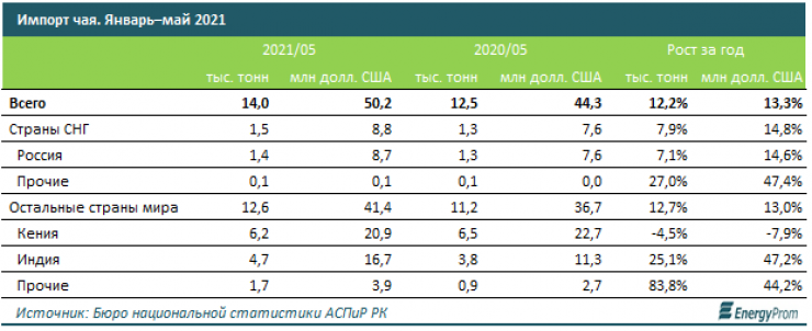 Импорт чая и кофе составил 69,9 процента. В страну ввезли 18,4 тысячи тонн этой продукции. С начала года в страну импортировали 14 тысяч тонн чая на 50,2 миллиона долларов США. Большего всего чая в страну ввезли из Кении - 6,2 тысячи тонн и из Индии - 4,7 тысячи тонн. Из СНГ завезли 1,5 тысячи тонн чая.
