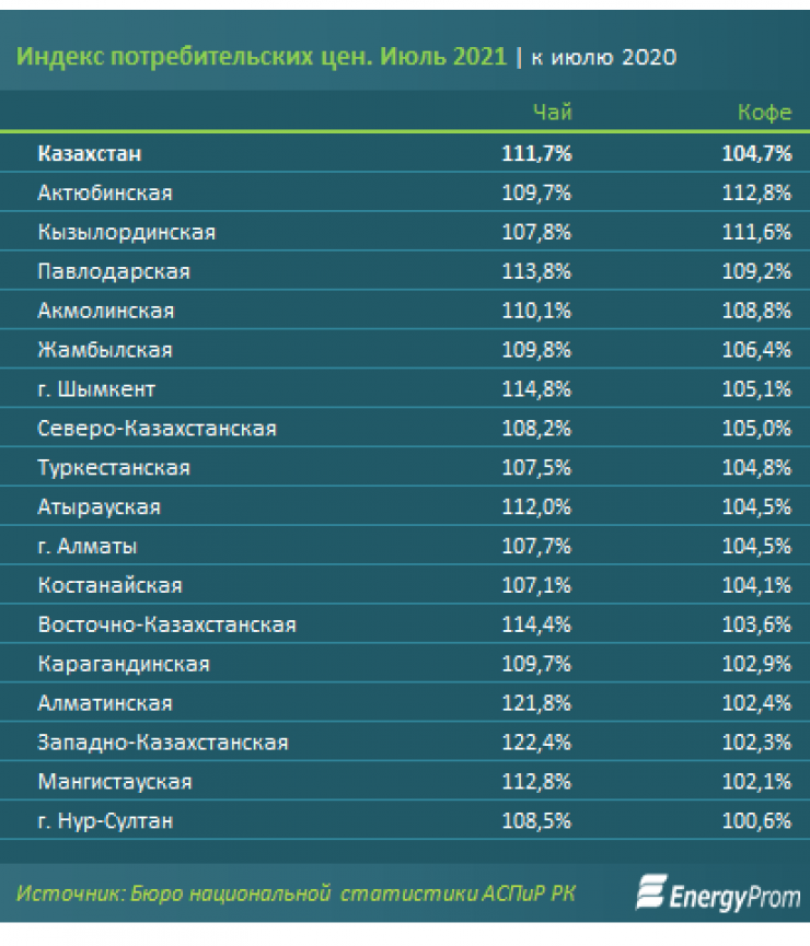 За год цена на чай возросла на 11,7 процента. Сильнее всего цена выросла в Западно-Казахстанской (на 22,4 процента), Алматинской области и Шымкенте.