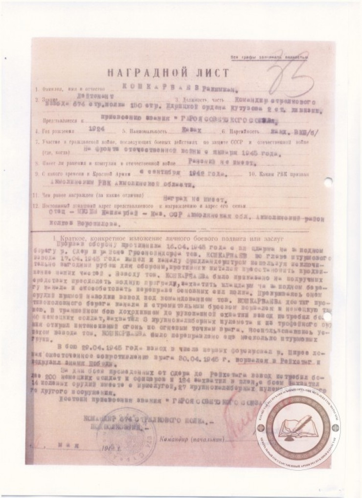 *Согласно журналу боевых действий 150-й стрелковой дивизии, в 14 часов 25 минут 30 апреля 1945 года лейтенант Рахымжан Кошкарбаев и рядовой Григорий Булатов "по-пластунски подползли к центральной части здания". 360 метров открытого пространства под шквальным огнем Кошкарбаев и Булатов ползли почти восемь часов.