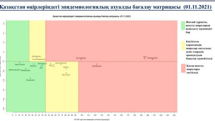 Согласно матрице оценки эпидемиологической ситуации в регионах Казахстана на 1 ноября, в "красной" зоне находятся: Костанайская, Павлодарская, Акмолинская и Северо-Казахстанская области.