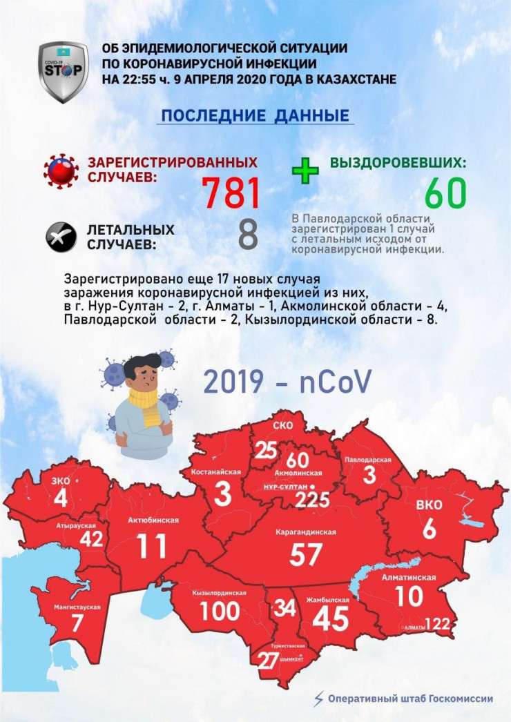 На данный час в Казахстане диагностирован 781 случай заражения коронавирусной инфекцией, 8 пациентов скончались, передает Tengrinews.kz со ссылкой coronavirus2020.kz.