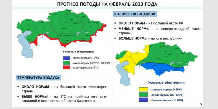 Сообщается, что количество осадков в феврале близко к норме на большей части территории страны. В Атырауской, Мангистауской, Актюбинской, Западно-Казахстанской и Костанайской областях количество осадков ожидается меньше нормы.