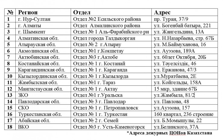 Дежурные ЦОНы есть только в областных центрах. В Улытауской и Жетысуской областях они будут определены позднее.