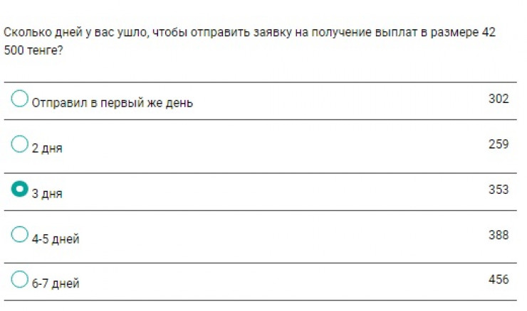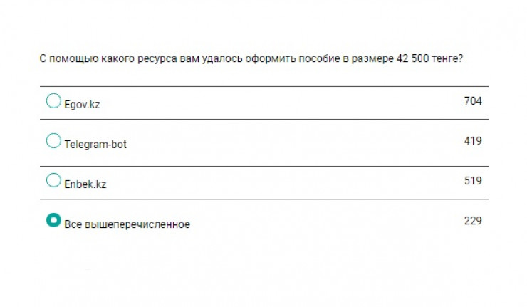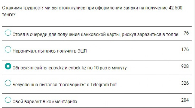Отдельного внимания заслужил вопрос о трудностях на пути получения заветных выплат. Выяснилось, что самым популярным путем подачи заявок стал Egov.kz, на втором месте расположился сайт Enbek.kz. Кстати, эти два способа и заняли первое место в "антирейтинге": сразу 928 человек сообщили, что с ними возникали сложности.