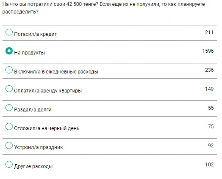 Большая часть опрошенных, а именно 64 процента, ответили, что купили бы на 42 500 тенге продукты. На втором месте ежедневные расходы, на них бы потратились 10 процентов пользователей. Еще 8 процентов использовали бы эти деньги для погашения кредитов.