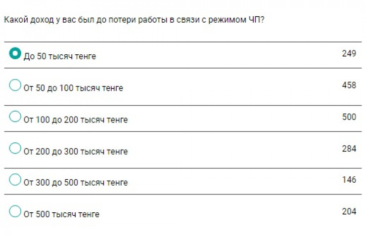 Также результаты опроса показали, каких доходов лишились люди из-за режима чрезвычайного положения. Выяснилось, что 15 процентов опрошенных потеряли доход до 50 тысяч тенге. Практически равномерно распределились суммы от 50 до 100 тысяч тенге и от 100 до 200 тысяч тенге, что составило 27 и 29 процентов, соответственно. Меньшая часть выбрала вариант "от 500 тысяч тенге", а именно 12 процентов.