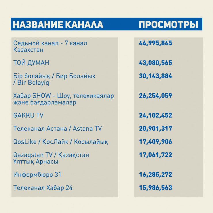 В топ-10 самых популярных телевизионных YouTube-каналов также входят GAKKU TV, шоу Qoslike, Qazaqstan TV, телеканал "Астана", "Информбюро 31", телеканал "Хабар 24".