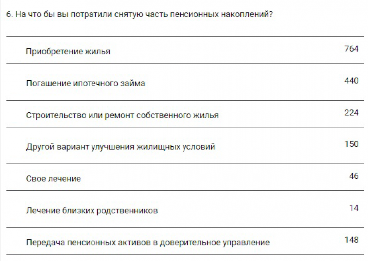 Напоследок читатели рассказали, на что бы они хотели потратить снятую часть пенсионных накоплений. Самое большое количество голосов (42 процента) набрал вариант ответа "Приобретение жилья". Вторая по популярности категория трат принадлежит погашению ипотечного займа - ее выбрали 25 процентов опрошенных. На третьем месте - строительство или ремонт собственного жилья (12 процентов). Меньше всего голосов набрал вариант ответа "Лечение близких родственников" - 0,8 процента.