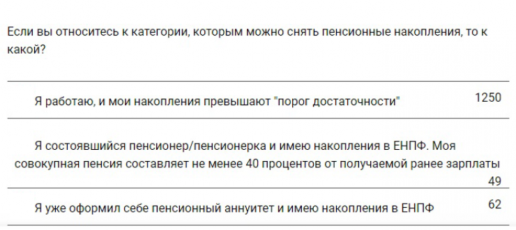 Из тех, кто подпадает под предварительные условия программы, 92 процента опрошенных имеет накопления, которые превышают "порог достаточности". Остальные восемь процентов разделились между состоявшимися пенсионерами и теми, кто оформил пенсионный аннуитет.