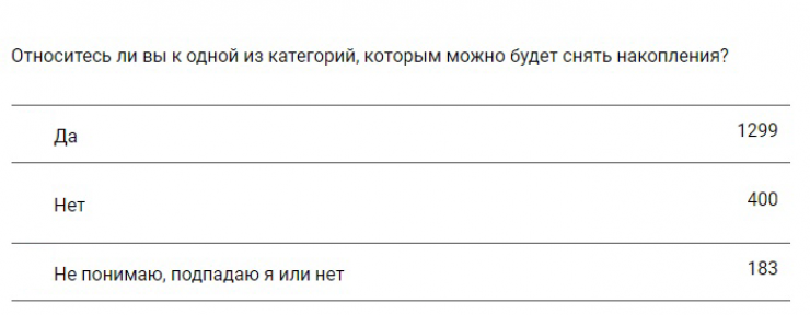 87 процентов опрошенных решили воспользоваться возможностью снятия накоплений после принятия новой нормы, девять процентов - будут принимать решение в зависимости от будущих обстоятельств. И только 35 читателей (два процента) не желают получать эти деньги. Еще 36 опрошенных отметили, что не подходят под условия программы.