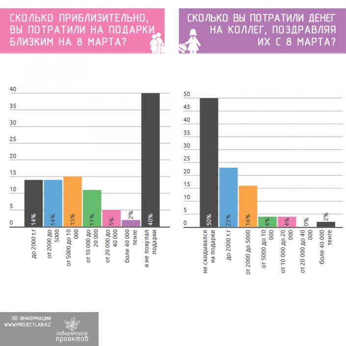 По их информации, 40 процентов респондентов не покупали подарков близким к 8 Марта, 15 процентов опрошенных потратили на подарки от пяти до десяти тысяч тенге. При этом, 14 процентов респондентов потратили на них не больше двух тысяч тенге. И столько же опрошенных - от двух до пяти тысяч тенге.