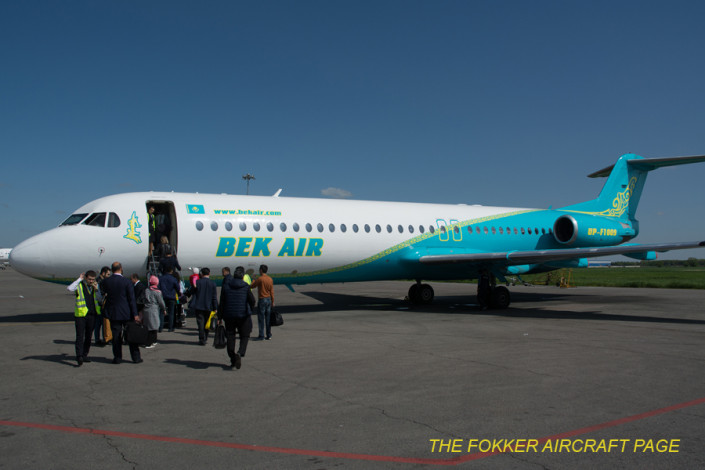 На сайте Fokker Aircraft сообщается, что 3 февраля 2018 года два бывших в эксплуатации португальской авиакомпании самолета F100 - CS-TPA и CS-TPF - были переданы компании Bek Air из Казахстана. По данным Ato.ru, один такой борт Bek Air приобрела и ранее, в 2016 году.