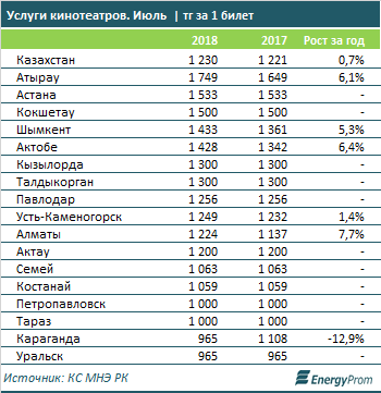 На радость казахстанцам, кинотеатры удерживают цены на билеты в кино. К августу поход на сеанс обходился жителям РК в среднем в 1 230 тенге на человека, что всего на 0,7 процента больше, чем годом ранее, говорится в исследовании Energyprom.kz.