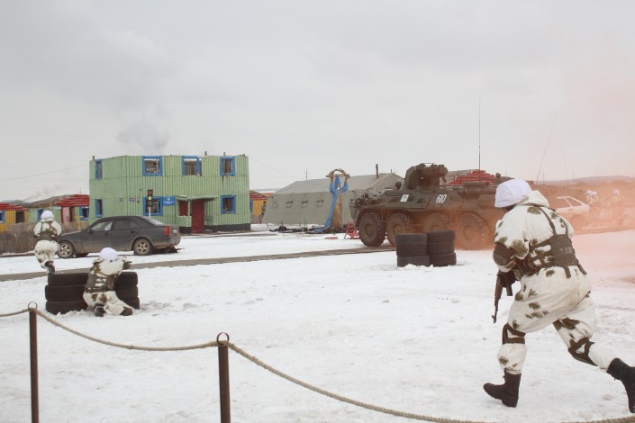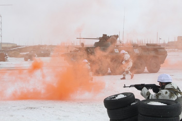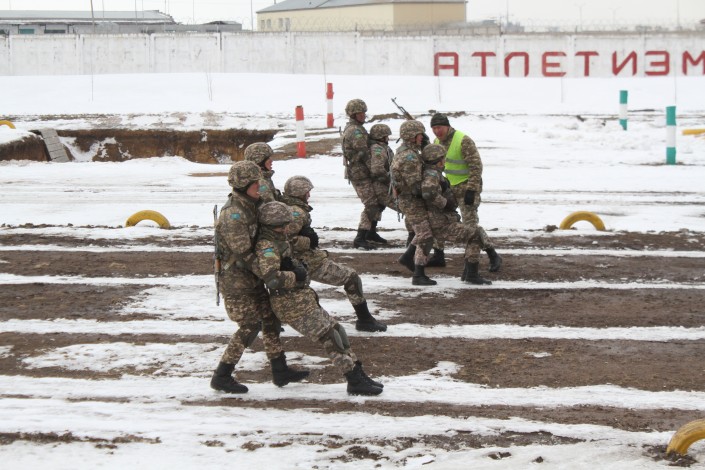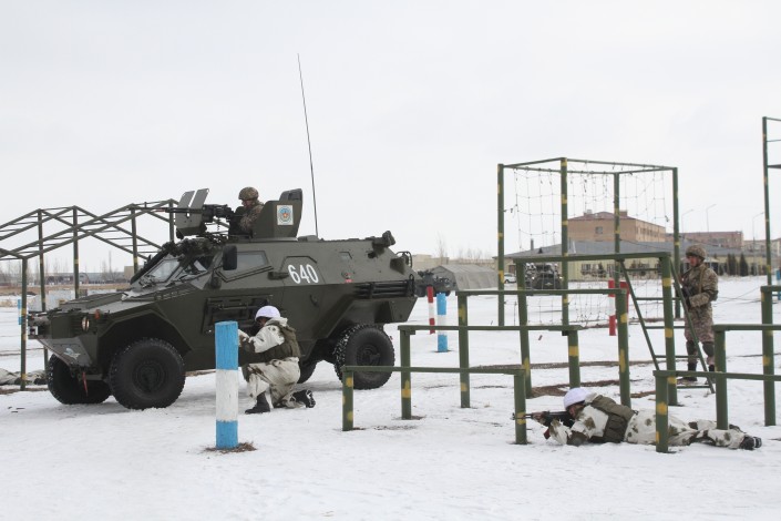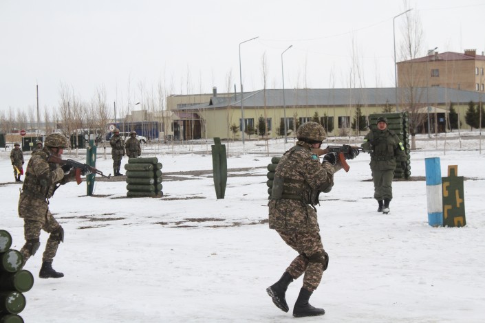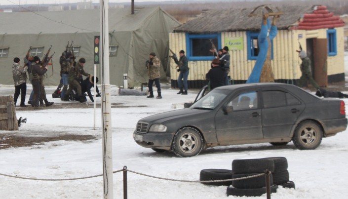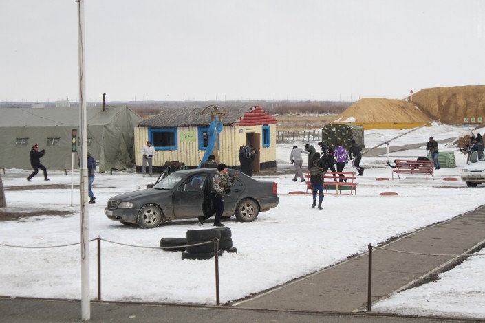 Сначала им продемонстрировали участок полигона, имитирующего центр населенного пункта. Там гуляли мирные жители, работал акимат. Но тут к перекрестку приехало несколько автомобилей с вооруженными людьми, которые тут же открыли огонь по населению.