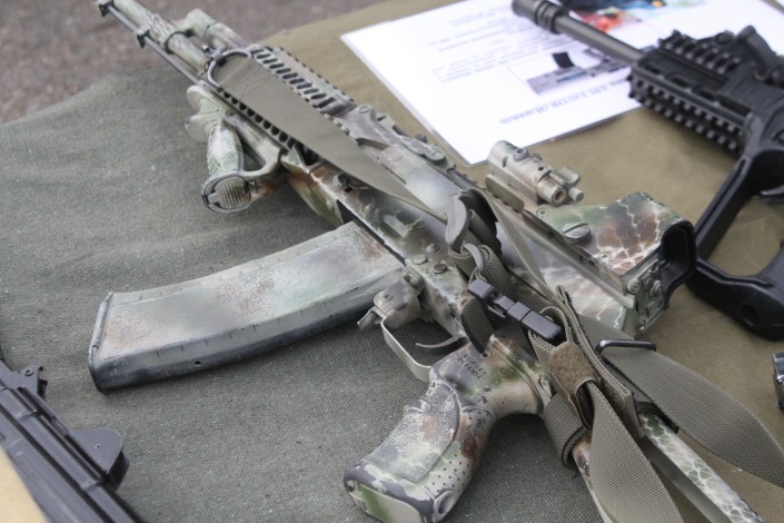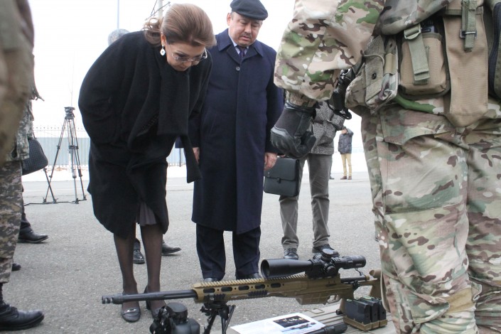 "Как игрушечный", - смеясь сказала Дарига Назарбаева, показывая на одну из штурмовых винтовок в маскировочном окрасе.