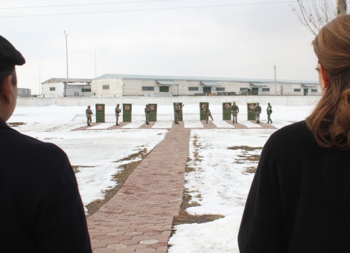 "Здесь проводятся занятия по боевой подготовке. Здесь, например, отрабатываются броски лопатки. Работаем", - сказал Нурлан Карибаев, обращаясь к шеренге бойцов, которые тут же одновременным броском вонзили саперные лопатки в мишени.