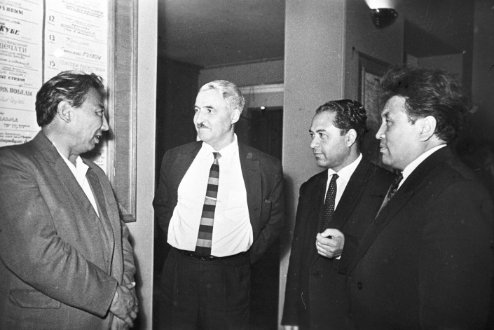 Кинорежиссер Михаил Ромм (крайний справа) во время встречи с главным редактором Алма-Атинского телевидения Игорем Саввиным (крайний слева) и кинорежиссером, оператором Берковичем М. Алма-Ата, 1958 год.