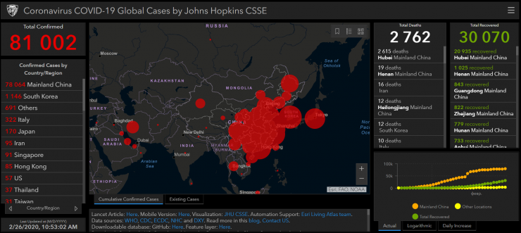 По актуальным данным, в мире более 81 тысячи человек заражены коронавирусной инфекцией. Число жертв COVID-19 достигло 2762 человек, более 30 тысяч человек полностью излечились после заражения.