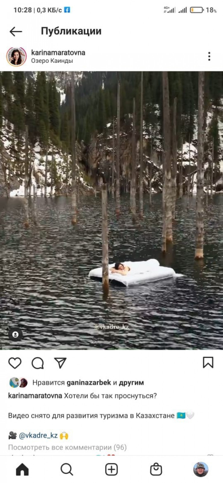 Напомним, казахстанцы сняли видеоролик на озере Каинды. На кадрах показано, как посреди знаменитого "затонувшего леса" плавает девушка на надувном матрасе. Ее поступок на территории национального парка возмутил общественность. Пост о поступке соотечественников был опубликован в Facebook на странице у натуралиста Сакена Дилдахмета, который выразил негодование из-за поступка молодых людей.