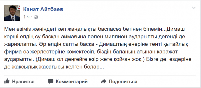 "Многие новости о нашей жизни я узнаю со страниц прессы. Они же (СМИ - прим.автора) опубликовали информацию о том, что Димаш перевел несколько миллионов в помощь затопленному региону в соседней стране. В каждом регионе свои традиции - китайская компания, являющаяся поклонником творчества Димаша, перевела в помощь своим соотечественникам деньги от имени Димаша. (Сам Димаш еще не достиг такого уровня.) Они, наверное, хотели сделать добро и нам, и себе", - написал Канат Айтбаев.