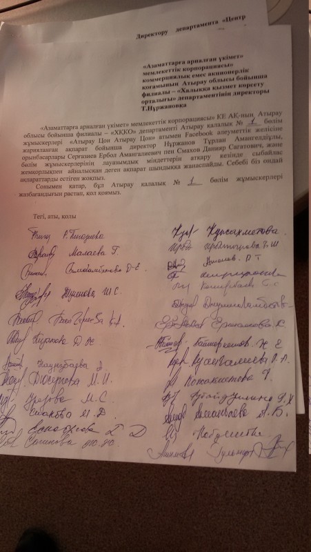 "Мы, работники ЦОН Атырауской области обращаемся к Вам с просьбой восстановить справедливость и дать возможность спокойно работать ЦОНу Атырауской области. У директора ЦОНа  Нуржанова Турлана Амангельдиевича открыта частная лавка, которая обеспечивает его безбедную жизнь. Он через своих подставных лиц, состоящих из его близких и дальних родственников, которые находятся в каждом направлении государственной услуги (накопительный, паспортный, кадровый отделы, бухгалтерия), получает взятки за оказание услуг", - говорится в письме, которое распространяют в соцсетях и через WhatsApp.