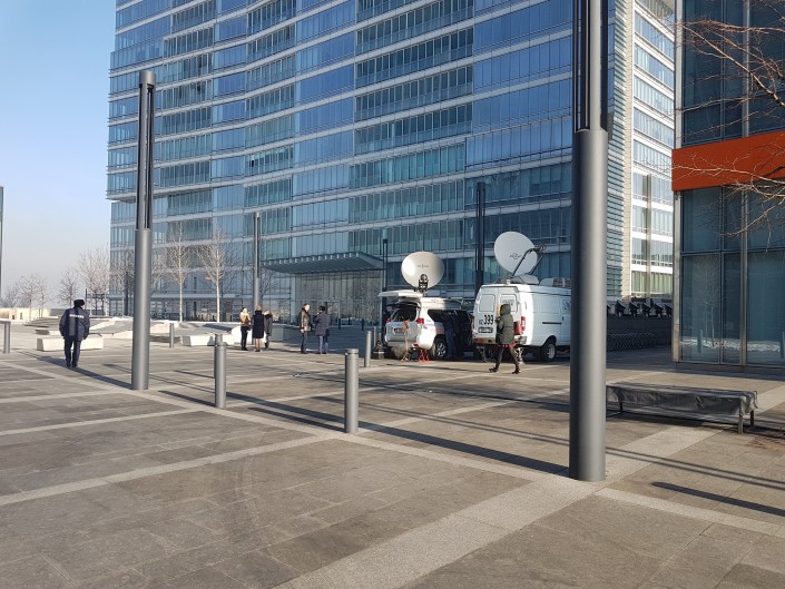 Также возле отеля организовали пресс-центр. Рядом с ним стоят передвижные телевизионные станции.
