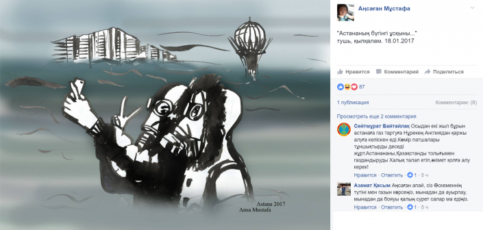 Смог в Астане вдохновил пользователей Интернета и на творчество. Так, Ансаган Мустафа на своей странице Facebook опубликовала рисунок под названием "Астананың бүгінгі ұсқыны"