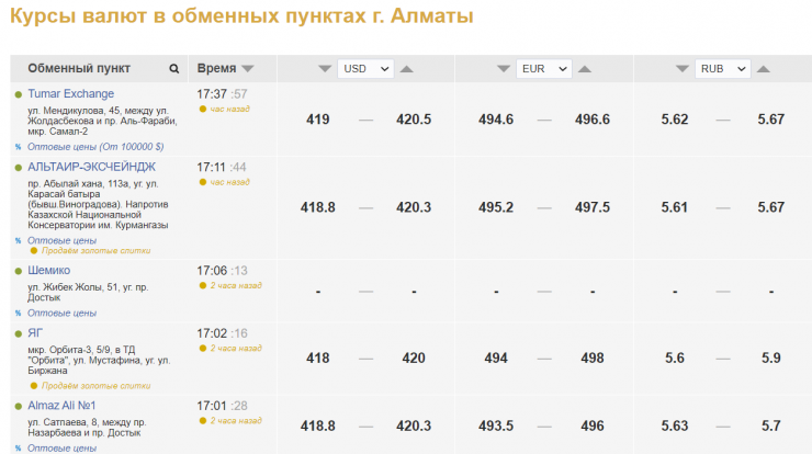 По данным kurs.kz, в настоящее время в обменных пунктах Нур-Султана доллар продают за 419,5-421 тенге, покупают - за 418,5-419 тенге, в Алматы обменники продают доллар по 420-420,5 тенге, покупают - за 418-419 тенге.