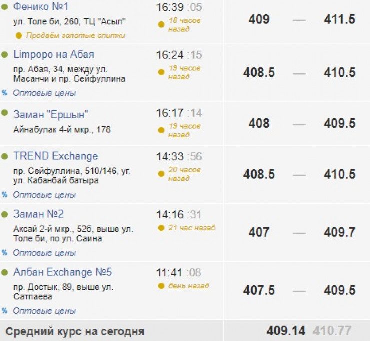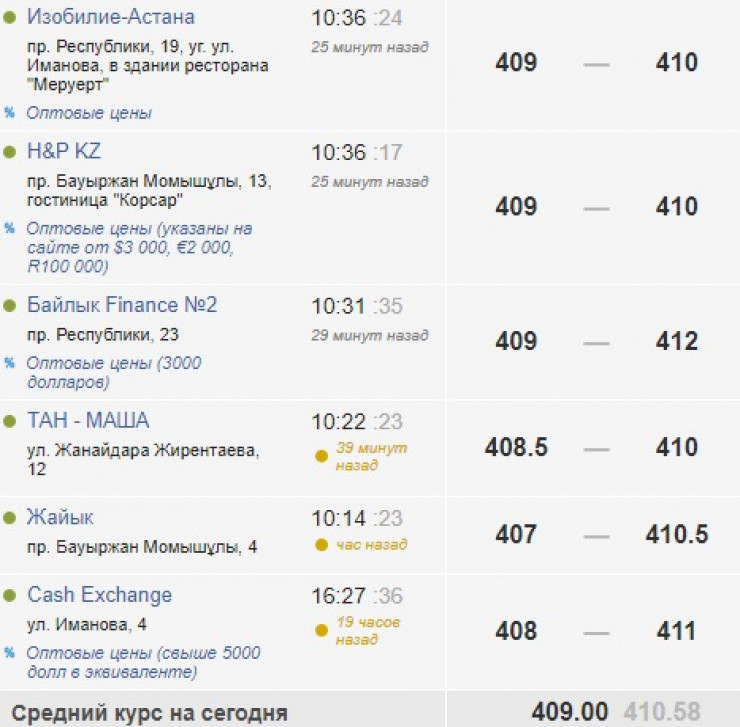 В Нур-Султане курс продажи составляет 410-412 тенге, покупки - 405-409 тенге.