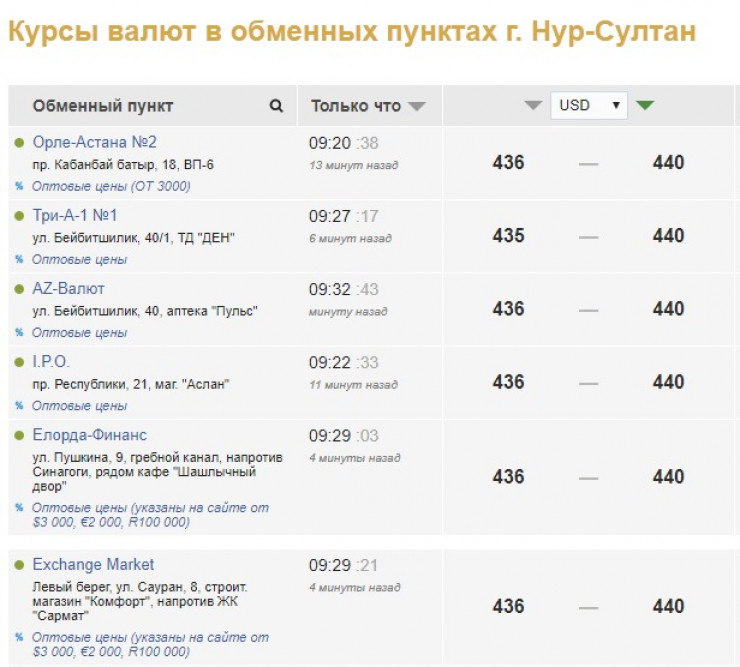 По данным kurs.kz на 9:30, американская валюта в частных обменных пунктах Нур-Султана стоит 440 тенге. Доллар в обменных пунктах Алматы продают по 439,5 тенге. Покупка установилась в пределах 435-437 тенге за доллар.