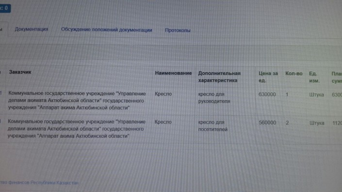 Помимо кресла для руководителя, на сайте размещен заказ на покупку двух кресел для посетителей, стоимостью 560 тысяч тенге каждое.