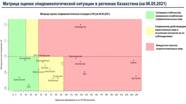 Сообщается, что в "красной" зоне находятся Нур-Султан, Алматы, Акмолинская, Жамбылская, Западно-Казахстанская, Карагандинская, Павлодарская области.