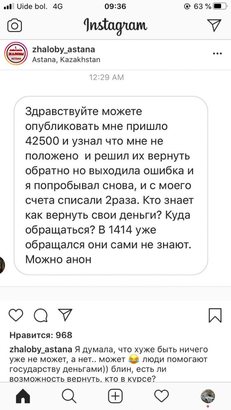 Ранее некоторые казахстанцы в соцсетях пожаловались, что за возврат выплаты снялась двойная сумма.
