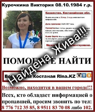 По факту пропажи Виктории Курочкиной в Костанайской области возбуждено дело по статье "Убийство" Приметы Виктории: европейский тип лица, рост 160-165 сантиметров, плотного телосложения, волосы прямые, крашенные в темный цвет, глаза голубые.