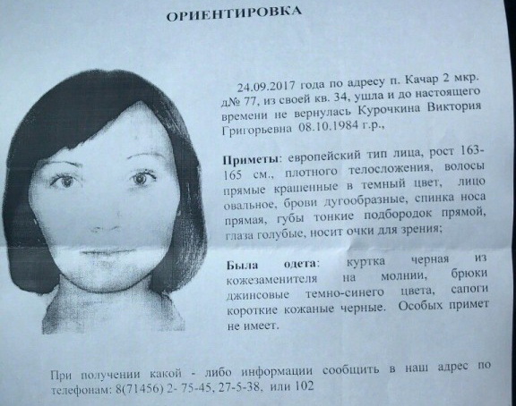 Жительница поселка Качар Виктория Курочкина исчезла 24 сентября 2017 года. Как рассказала сестра пропавшей женщины Римма Рыжова, раньше Виктория работала в охране, а с 25 сентября планировала выйти на работу в теплоцентр, о чем сообщила посредством соцсетей.