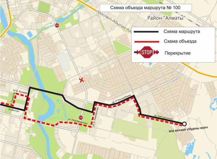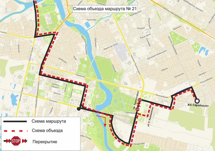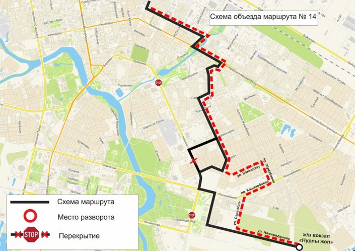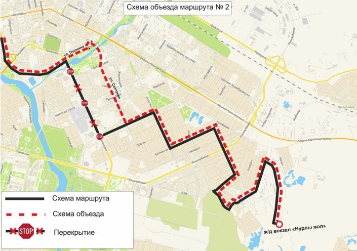 От начального остановочного пункта "ж/д вокзал "Нурлы жол" до пересечения улицы Байтурсынова - улица Сарыколь без изменения, далее направо на улицу Сарыколь, направо на проспект Кошкарбаева, налево на проспект Жумабаева, налево на улицу Балкантау, направо на улицу Обаган, далее по существующей схеме движения.