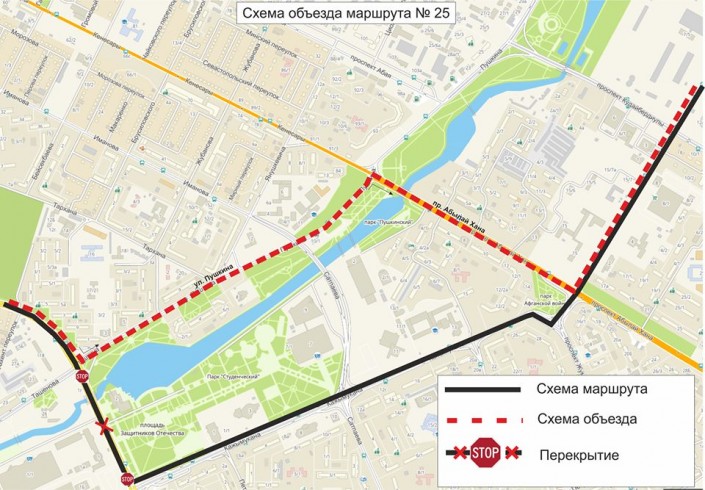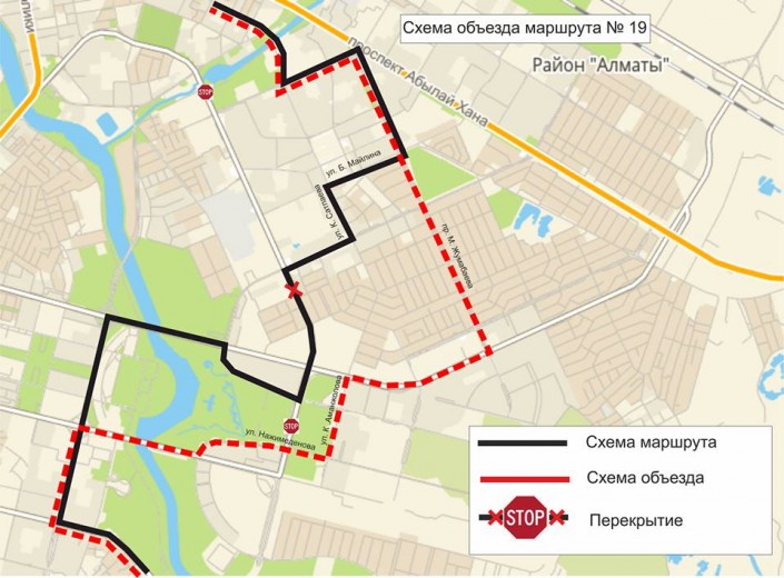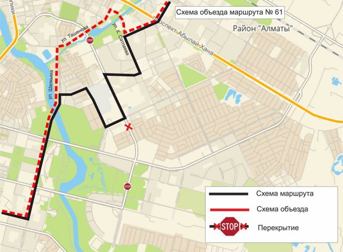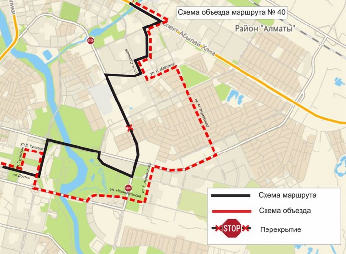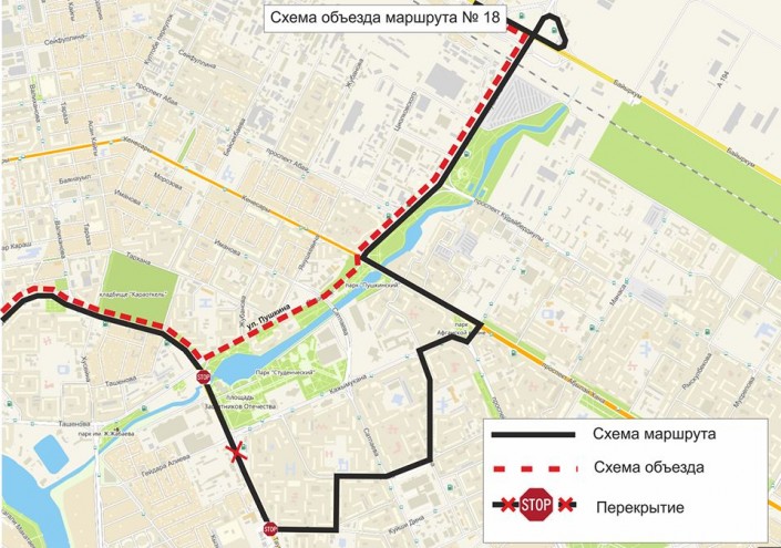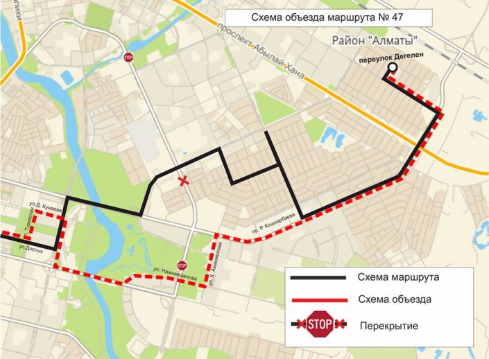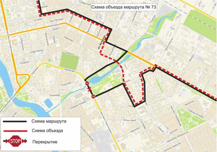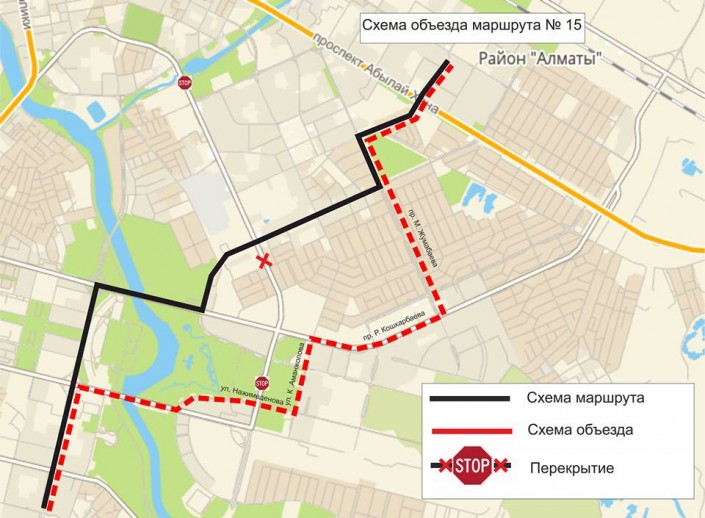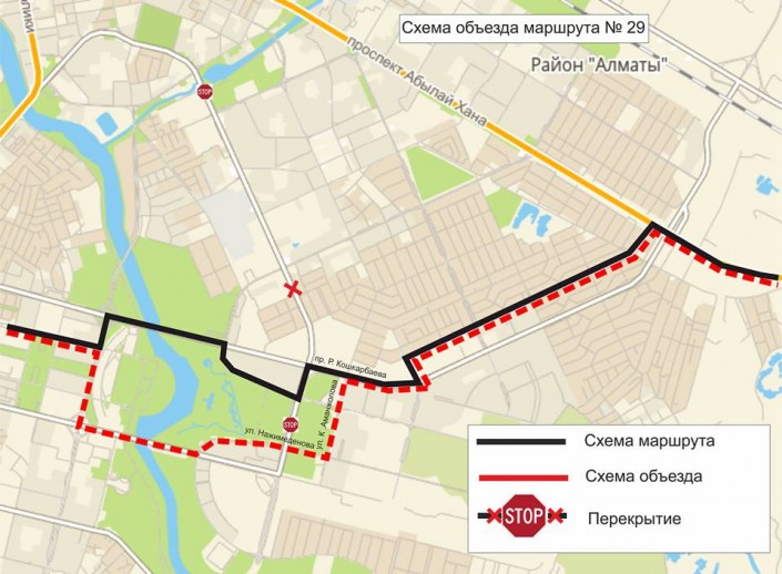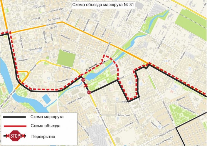 От конечного остановочного пункта "Ж/М "Заречный" до пересечения Кравцова - Пушкина без изменений, далее налево на Пушкина - Абылай хана, далее по существующей схеме движения. В обратном направлении по аналогичной схеме движения.