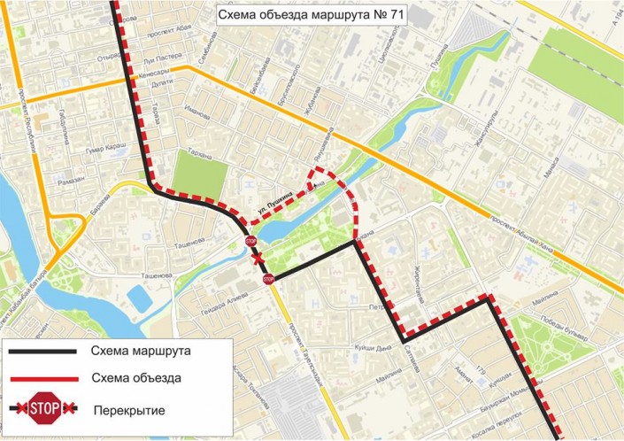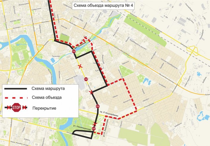 От начального остановочного пункта "Центр ПСМП "Достық" до пересечения Пушкина - Кенесары без изменений, далее прямо по Пушкина - Кравцова, далее по существующей схеме движения. В обратном направлении по аналогичной схеме движения.