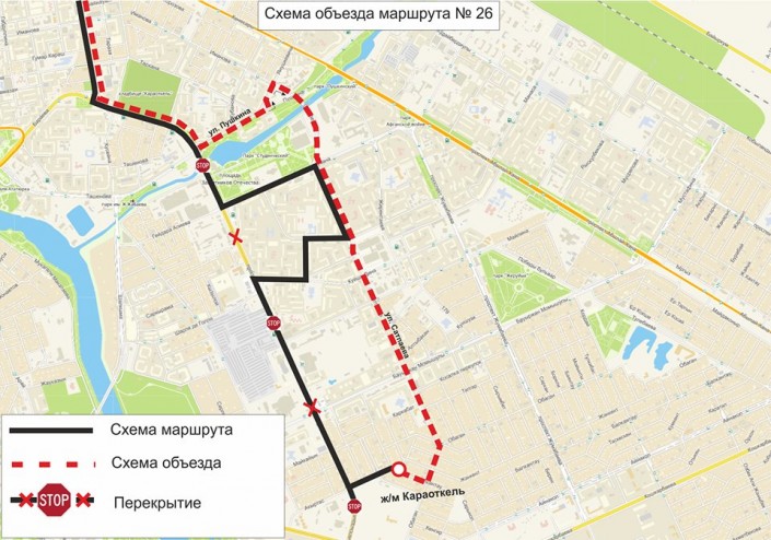 От начального остановочного пункта "Ж/д вокзал" до пересечения Кравцова - Пушкина без изменений, далее налево на Пушкина - Абылай хана, далее по существующей схеме движения. В обратном направлении по аналогичной схеме движения.