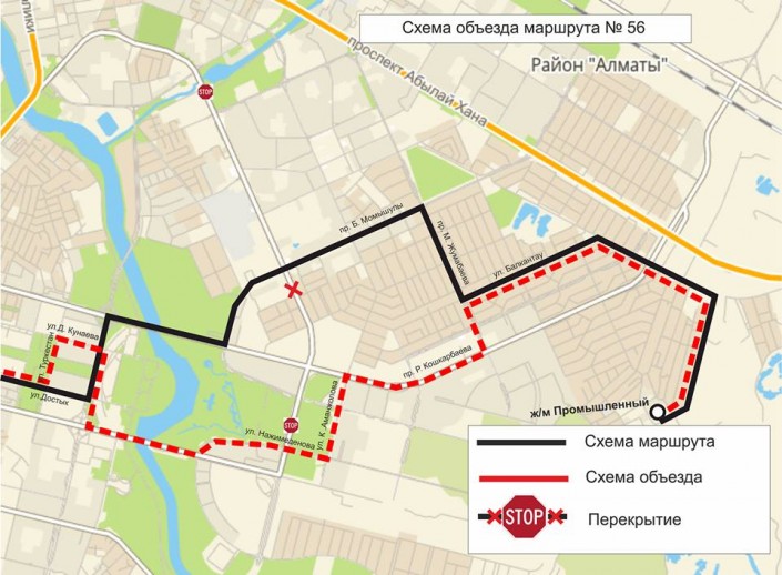 От начального остановочного пункта "Ж/М "Промышленный" до пересечения Балкантау - М. Жумабаева без изменений, далее налево М. Жумабаева - Р. Кошкарбаева - К. Аманжолова - Нажимеденова - Сыганак - Мәңгілік Ел - Д. Кунаева - Туркестан - Достык, далее по существующей схеме движения. В обратном направлении по аналогичной схеме движения.