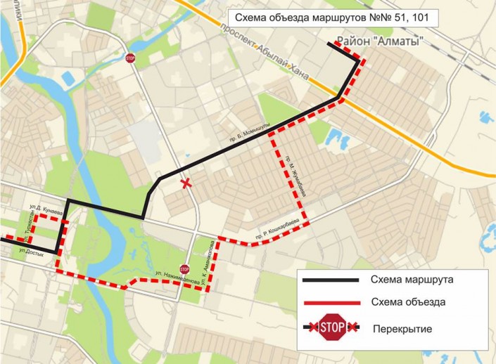От начального остановочного пункта "Ж/М "Железнодорожный" до пересечения проспекта М. Жумабаева - Б. Момышулы без изменений, далее прямо по М. Жумабаева - Р. Кошкарбаева - К. Аманжолова - Нажимеденова, далее по существующей схеме движения. В обратном направлении по аналогичной схеме движения.