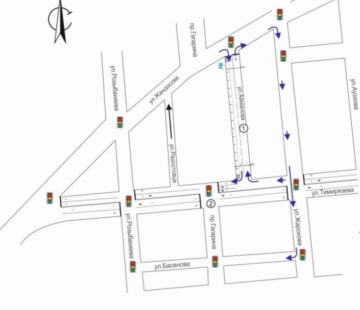 Ранее по новым правилам по улице Тимирязева от улицы Жандосова до улицы Байтурсынова запретили левые повороты. Это связано с внедрением BRT (Bus rapid transit) - скоростного автобусного маршрута по улице Тимирязева.