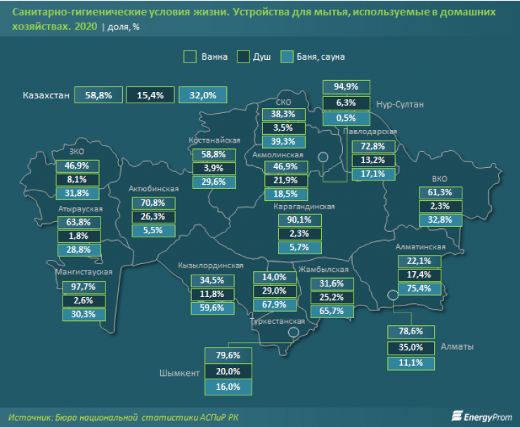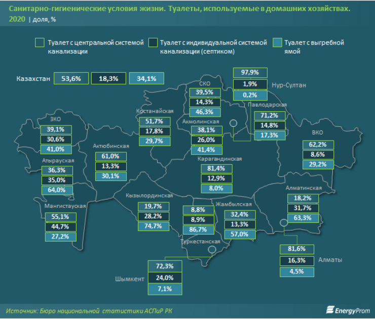 Туалетами с центральной канализацией лучше всего обеспечены домохозяйства Нур-Султана и Алматы, а также Карагандинской области. Хуже всего с туалетами с центральной канализацией обстоят дела в Туркестанской области: ими оборудованы лишь 8,8 процента домохозяйств. В тройку аутсайдеров также попали Алматинская и Кызылординская области.