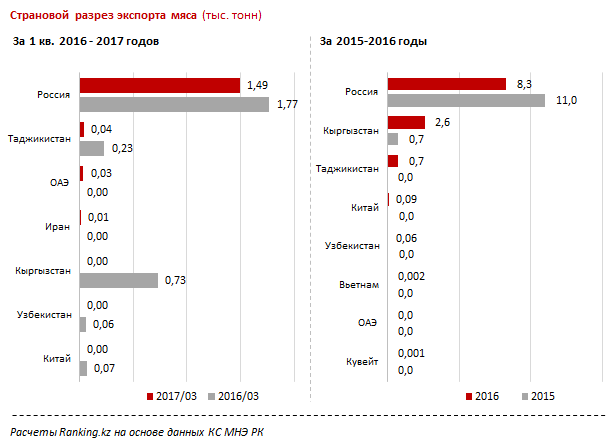 Практически весь объем продукции, поставляемой на экспорт, забирает Россия - в текущем году это составило 94,5 процента, или 1,5 тысячи тонн. За 2016 год в российском направлении было отгружено порядка 70 процентов всего мясного экспорта РК.