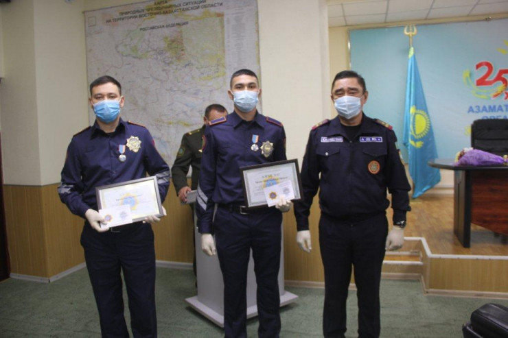 Кроме того, в Департаменте по ЧС ВКО прошло торжественное вручение нагрудных знаков "Төтенше жағдайлардағы ерлігі үшін" и сотрудникам Департамента полиции Восточно-Казахстанской области Диасу Агзамову и Азамату Ибрайханову, которые проявили героизм и спасли при пожаре семью из трех человек в Семее.