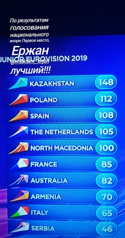 По итогам голосования профессионального жюри и зрителей юный вокалист из Казахстана набрал 227 баллов. Отметим, что по результатам голосования национального жюри Ержану Максиму досталась первая строчка.