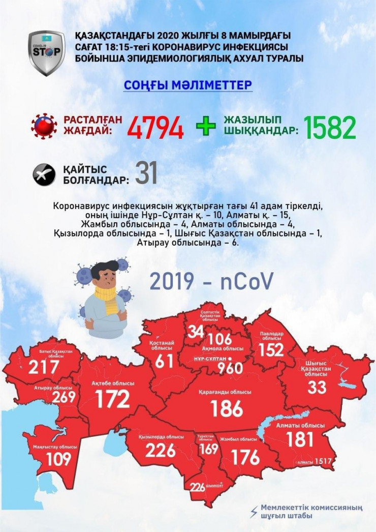 Число заразившихся коронавирусом выросло в Казахстане до 4794: